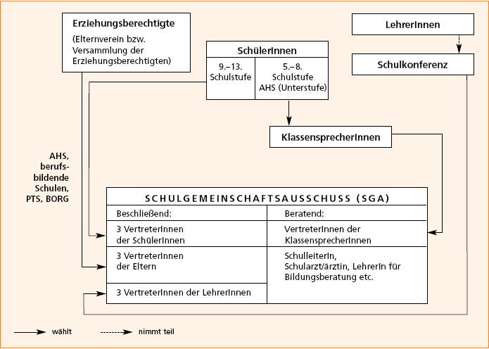 In allgemeinbildenden höheren Schulen (AHS), berufsbildenden Schulen, polytechnischen Schulen und Bundesoberstufenrealgymnasien (BORG) ist der Schulgemeinschaftsausschuss (SGA) das zentrale Gremium der Schuldemokratie: Der SGA bildet sich aus je drei gewählten InteressensvertreterInnen der SchülerInnen, LehrerInnen- und ElternvertreterInnen. Vonseiten der SchülerInnen sind der/die SchulsprecherIn und seine/ihre StellvertreterInnen im SGA vertreten, vonseiten der LehrerInnen werden drei VertreterInnen in der Schulkonferenz aus ihrem Kreis gewählt. Falls es an der Schule keinen Elternverein gibt, entsendet die Elternvollversammlung drei gewählte VertreterInnen, ansonsten obliegt diese Aufgabe dem Elternverein. Der Direktor/die Direktorin muss zumindest zwei SGA-Sitzungen (in den Berufsschulen zumindest eine Sitzung) pro Schuljahr einberufen.