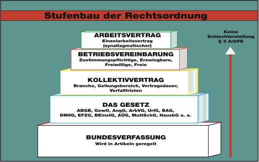 Um zu verstehen, welche Rolle Kollektivverträge und Betriebsvereinbarungen spielen, ist der Stufenbau der Rechtsordnung wichtig. Eine höher liegende Stufe der Pyramide baut auf der vorhergehenden auf. Mit Ausnahme der Arbeitszeit dürfen ArbeitnehmerInnen mit jeder Stufe nur besser- und nicht schlechtergestellt werden als auf der vorherigen Stufe (Günstigkeitsprinzip). So darf ein Kollektivvertrag keine Regelungen enthalten, die für die ArbeitnehmerInnen schlechter sind als jene im Gesetz. Ein Arbeitsvertrag ist also nur dann gültig, wenn er den Bestimmungen der Betriebsvereinbarungen entspricht. Betriebsvereinbarungen müssen mit dem geltenden Kollektivvertrag vereinbar sein, der wiederum der Gesetzeslage entsprechen muss.Links