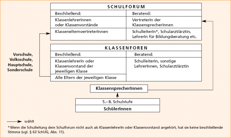 Im Schulforum werden Entscheidungen getroffen, die die gesamte Schule oder mehrere Klassen betreffen, beispielsweise wie viele Klassen es in der Schule geben soll. Das Schulforum tagt zumindest in den ersten neun Wochen nach Schulbeginn, den Vorsitz hat der/die SchulleiterIn.In jedem Klassenforum wird ein/e KlassenelternvertreterIn und dessen -stellvertreterIn gewählt. Diese KlassenelternvertreterInnen und alle KlassenlehrerInnen (in der Volksschule und Vorschule) sind im Schulforum. Die SchülerInnen sind nicht direkt vertreten.
