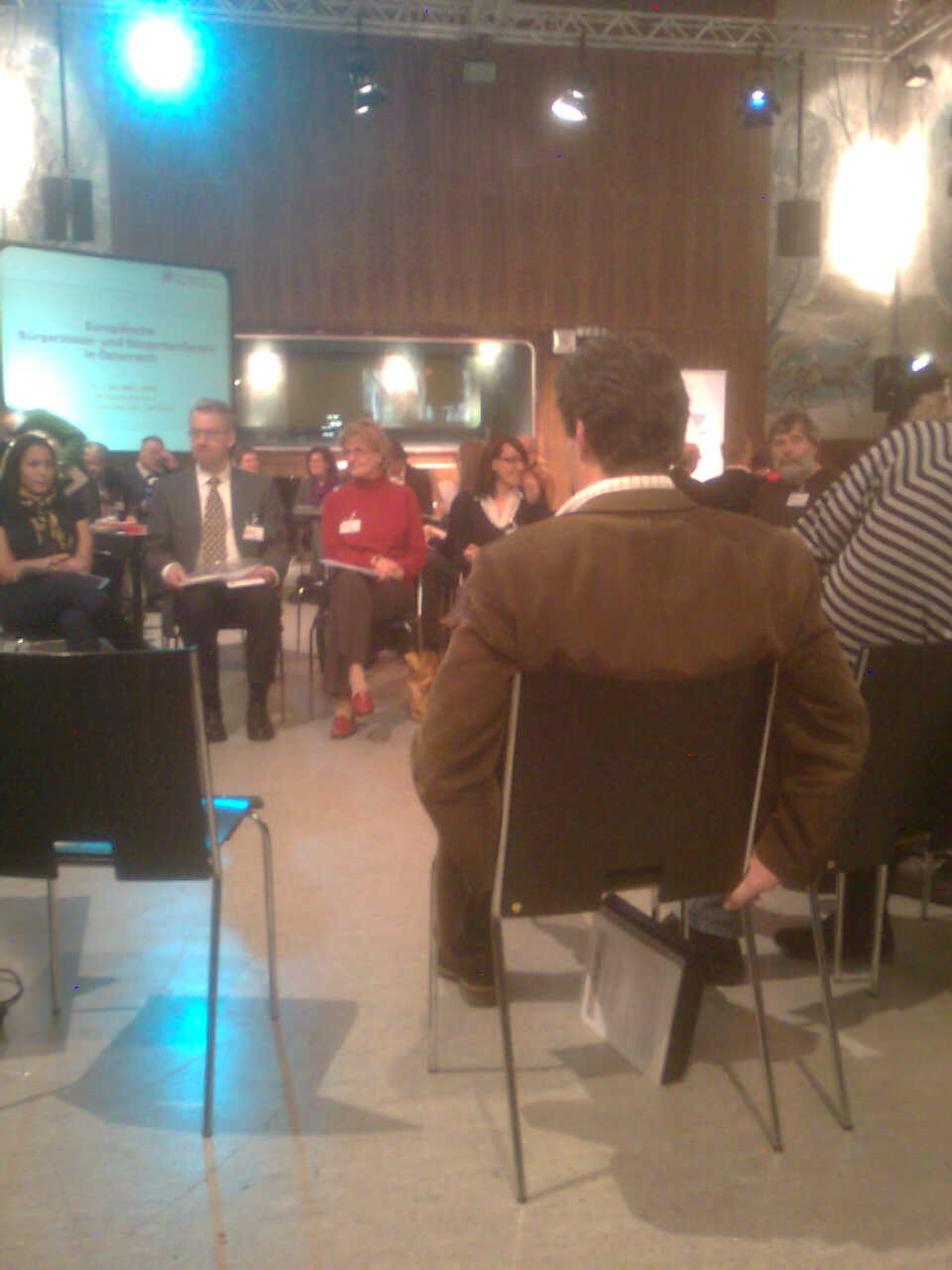 Der Tag startet mit einer Einleitung von Dr. Martin Bernhofer, dem Leiter des Radio Kulturhauses. Obwohl zeitgleich zu dieser Konferenz neun andere in verschiedenen europäischen Ländern stattfinden, ist diese Bürgerkonferenz in Wien die einzige, die in einem Radiokulturhaus abgehalten wird. Bernhofer freut sich und begründet das folgenermaßen: schon die Radiotheorie von Brecht forderte eine Interaktivität des Mediums Radio - es sollte nicht nur Sender sein, sondern auch seine Rezipienten sollten zu Wort kommen. Das gleiche, was in der Europäischen Union auch gefordert wird: Ein Mitwirken der BürgerInnen. Denn so funktioniert Politik - durch das Partizipieren eines jeden, Kommunikation und Diskussionen.